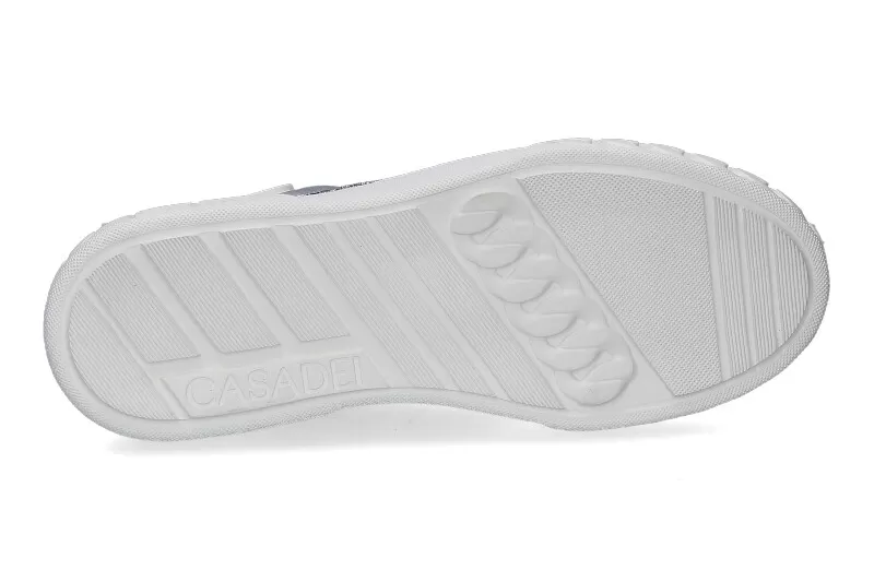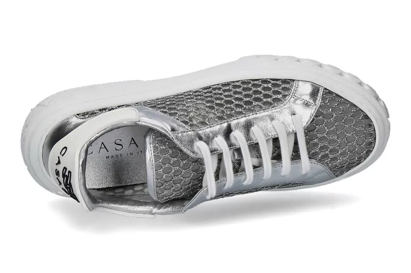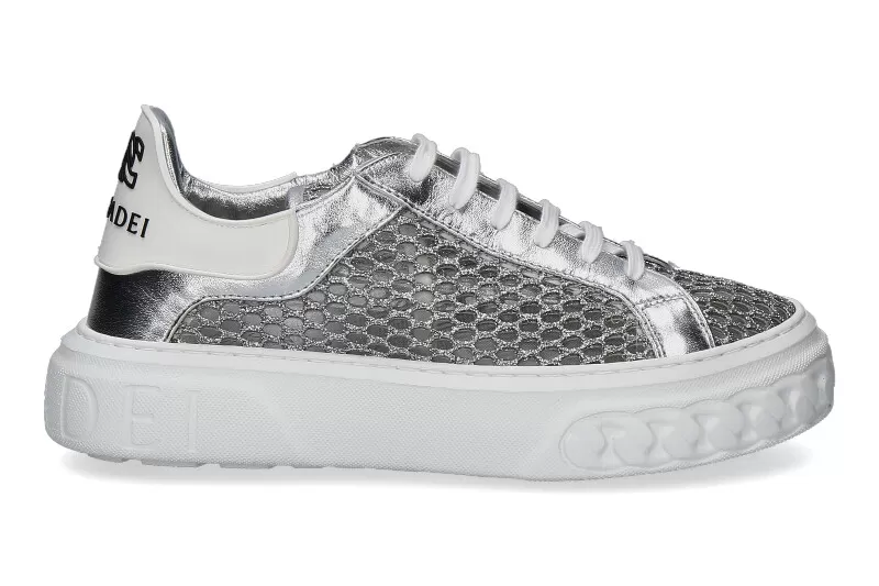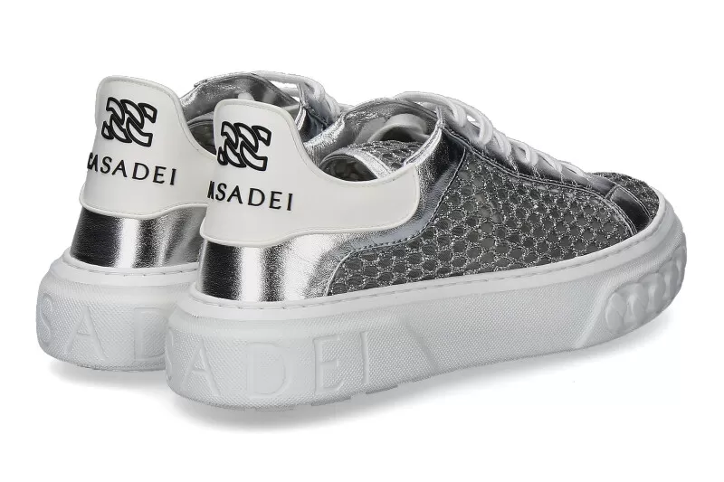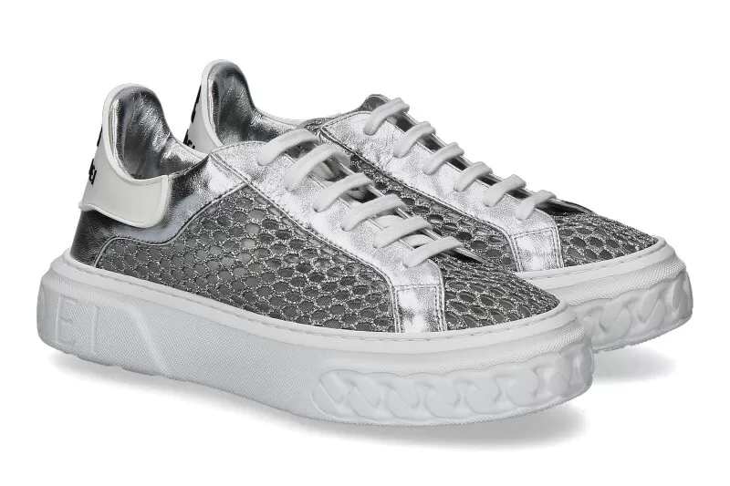 The silver glittery sneaker by CASADEI is a must-have for the summer. The beautiful details on the thick rubber sole and the black decoration on the heel make this shoe a real eye-catcher. The airy creation is perfect for any occasion. 100% made in Italy.