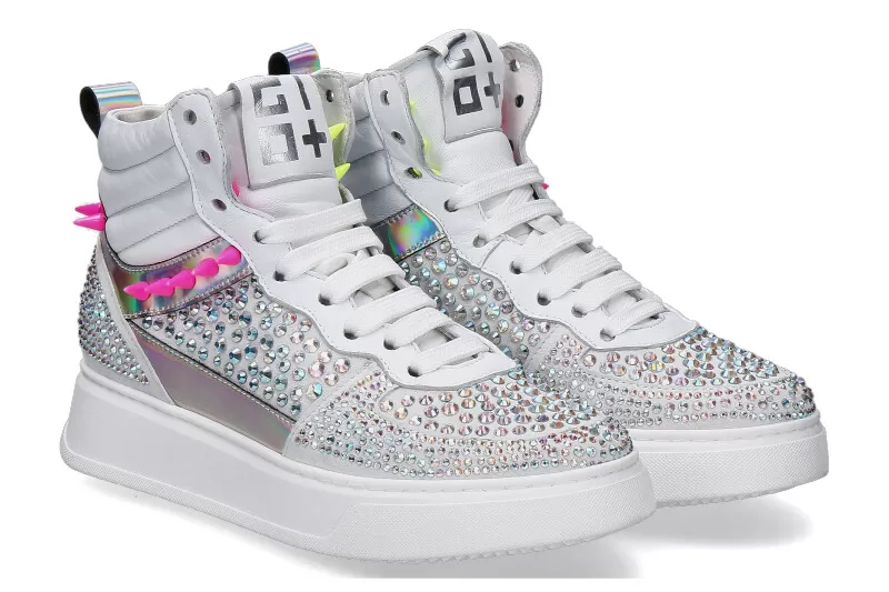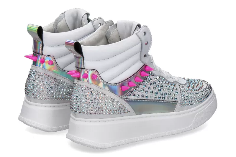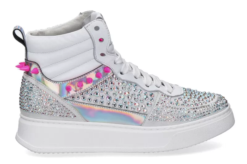 The extravagant sneaker made of white leather is studded with glittering stones. The neon pink, pointed studs make the shoe an eye-catcher. The high-top sneaker is lined with leather on the inside. The changeable insole is also made of leather. The sporty rubber outsole rounds off the unusual look. The shoes are designed and manufactured in Italy.