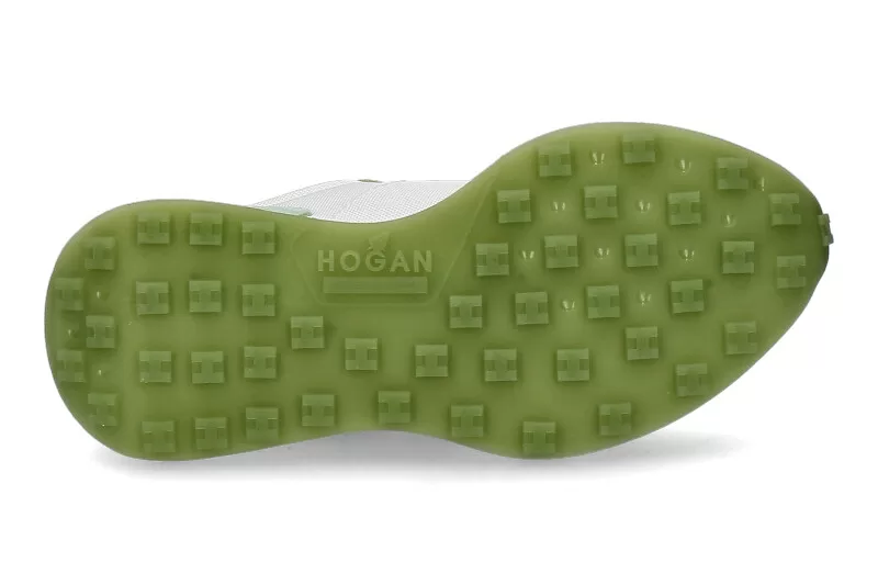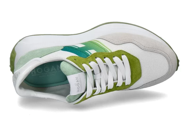 The colourful H641 sneaker from Hogan in various shades of green is a real eye-catcher. The mix of suede and technical fabric is unique and absolutely trendy. The design of the sneaker has a slight retro charm. The insole and the lining are both made of leather. The special insole provides optimal support for the foot when walking and standing.