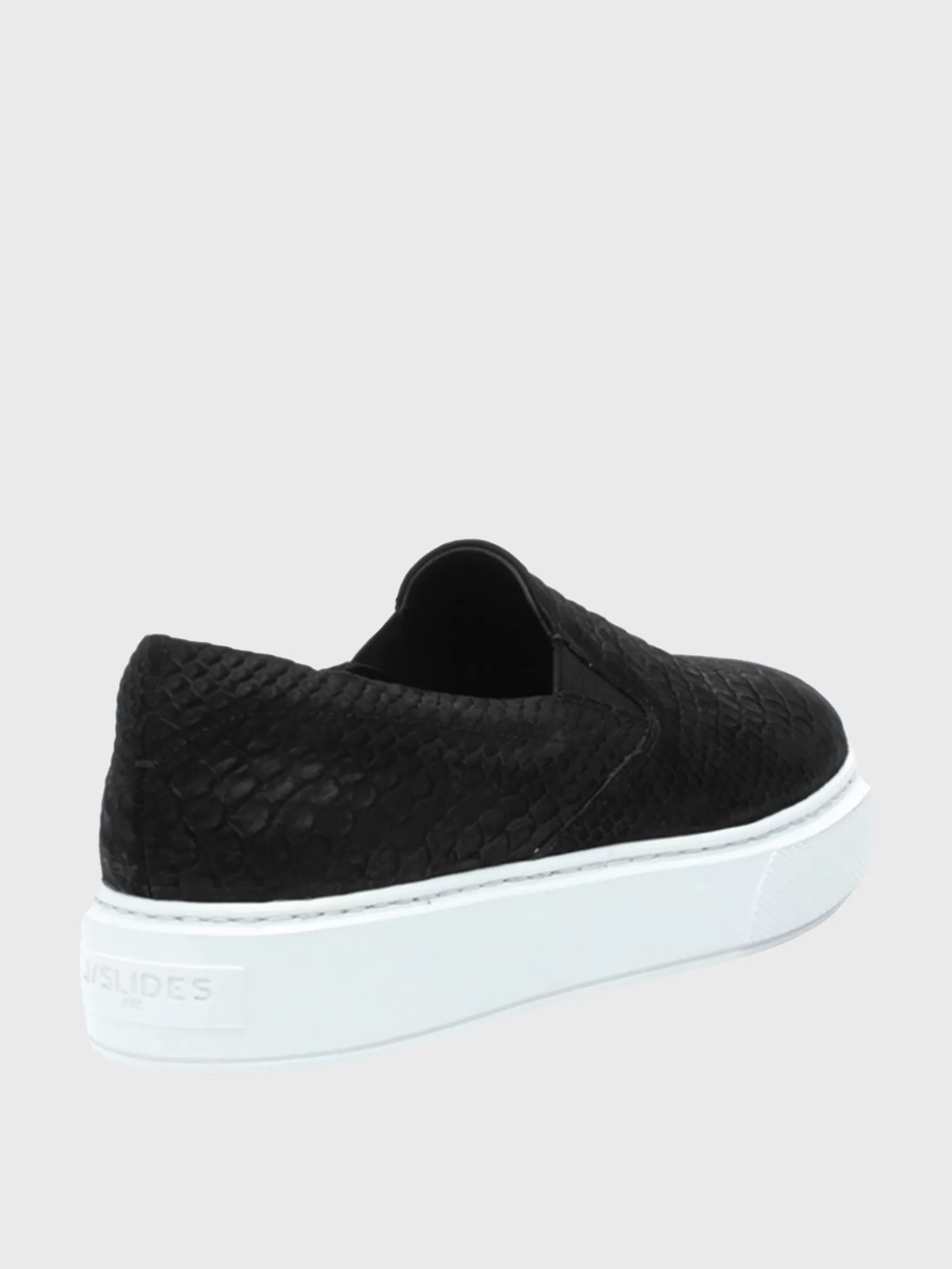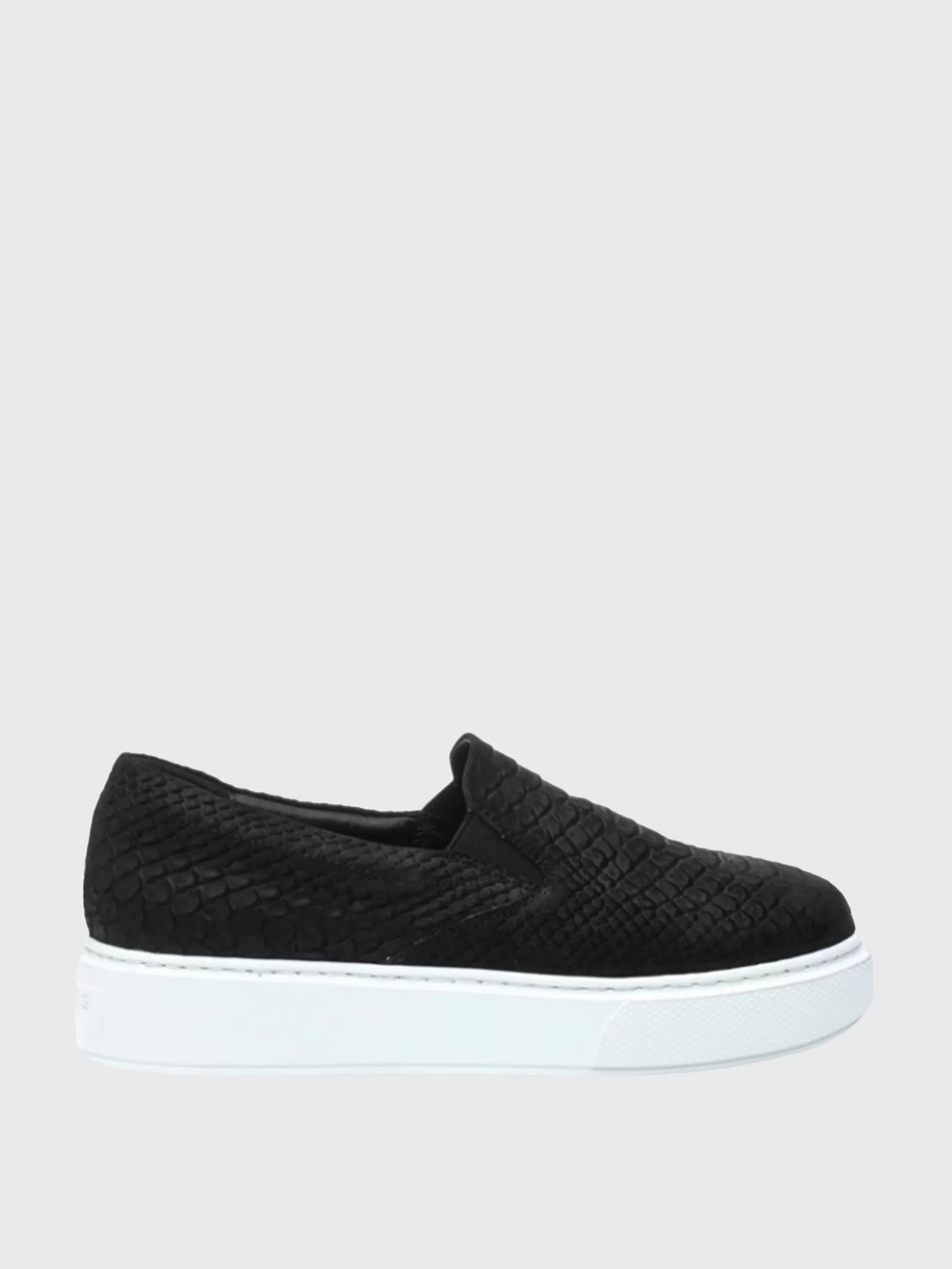 The J/Slides Delia Black Embossed Sneaker features an AIR LITE rubber platform for lightweight style.