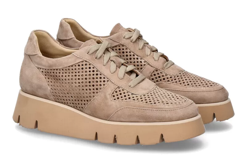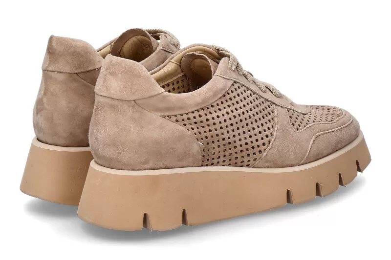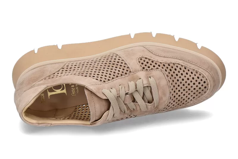 The fashionable CAMOSCIO NEW COXA sneaker made of suede in a delicate brown shade from Luca Grossi is a must-have for any shoe wardrobe. The design of the shoe is very contemporary yet classic. The fine perforations on the top and sides of the shoe add texture and breathability. The cushioned insole provides extra comfort for the feet, while the raised rubber sole provides excellent grip and traction. The shoes from Luca Grossi are made in Italy under high quality standards.