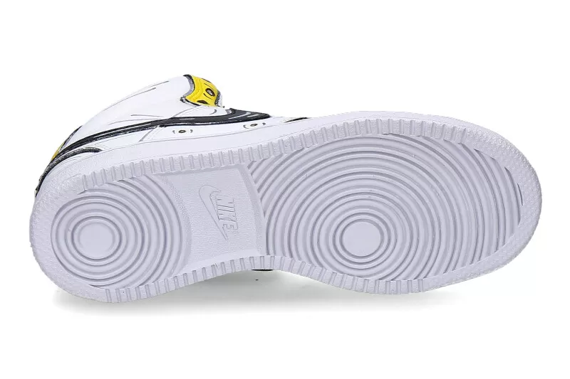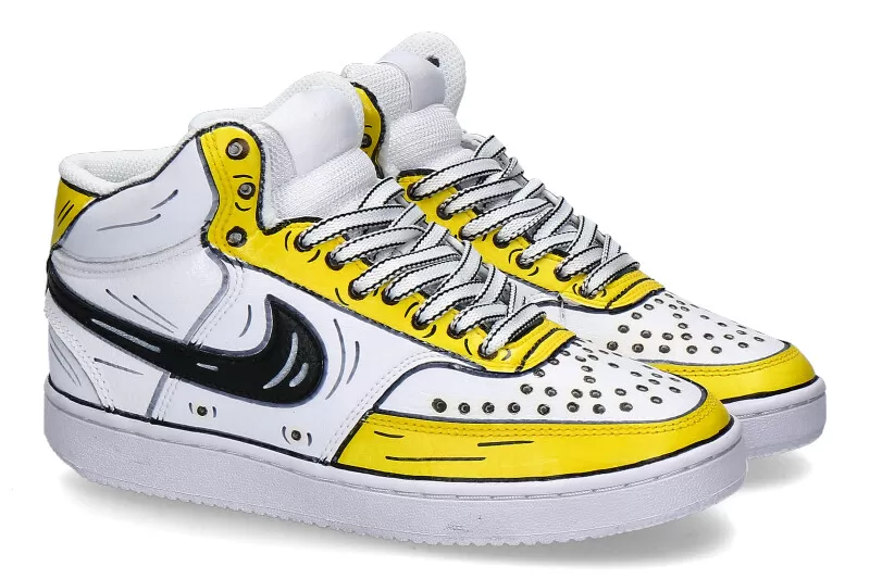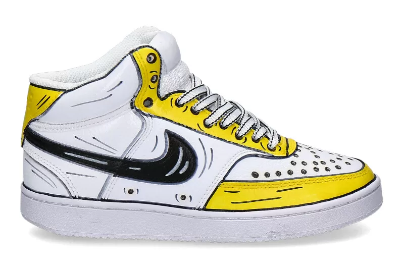 Ein Fashion-Statement ist der Nike Sneaker aus weissem Leder. Der Sneaker wurde handbemalt im Cartoon- Look in Italien. Gepolstert ist der Knöchelrand. Herausnehmbar ist die Innensohle aus Textil. Jeder Schuh ist ein Unikat und mit Sicherheit ein Blickfang.
