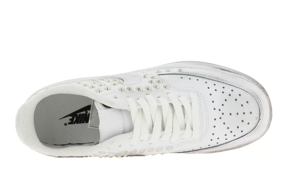 Ein Blickfang ist der Nike Sneaker Customized aus weissem Leder mit Nieten im Used-Look. Das Modell verfügt über eine Textilinnensohle sowie einem gepolsterten Textilfutter. Rutschfest ist die Gummisohle. Der Sneaker wurde in Italien von Hand customized und somit ist jedes Modell ein Unikat.