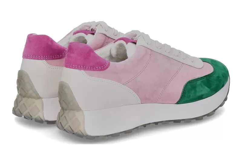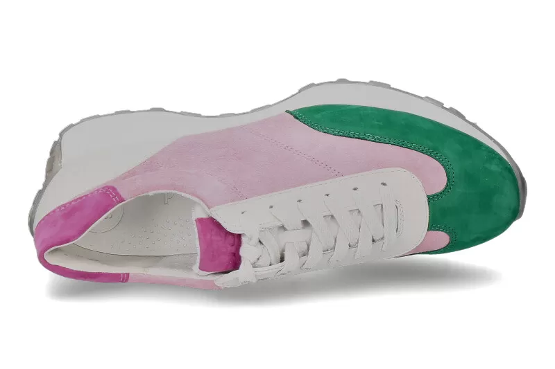 The colourful sneaker from PAUL GREEN is made of a material mix of suede and smooth leather. The combination of pink, rose and rich green perfectly reflects the colours of summer. The white sporty sole rounds off the trendy look perfectly. The shoe is equipped with a leather lining. The super soft insole, which is also made of leather, guarantees a pleasant wearing comfort. The shoes are made in Austria and are characterised by a great fit.